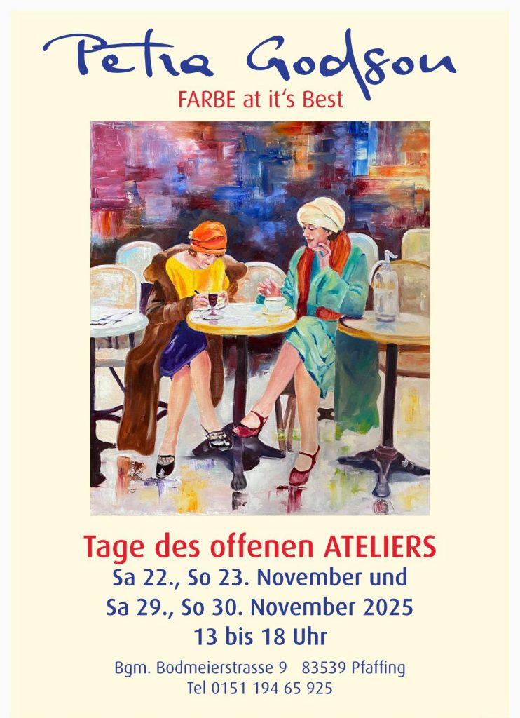 Entdecken Sie die faszinierende Welt der Farben! Am Tag der offenen Tür in der kleinen Galerie von Petra Godson erwarten Sie atemberaubende Kunstwerke, die in Aquarell, Öl und Pastell geschaffen wurden. Lassen Sie sich von der Lebendigkeit und der Ausdruckskraft der Bilder mitreißen. Jedes Kunstwerk erzählt seine eigene Geschichte und lädt Sie ein, in die kreative Vision der Künstlerin einzutauchen. Verpassen Sie nicht die Gelegenheit, die beeindruckenden Werke zu erleben und sich von der Kunst inspirieren zu lassen. Ich freue mich auf Ihren Besuch!